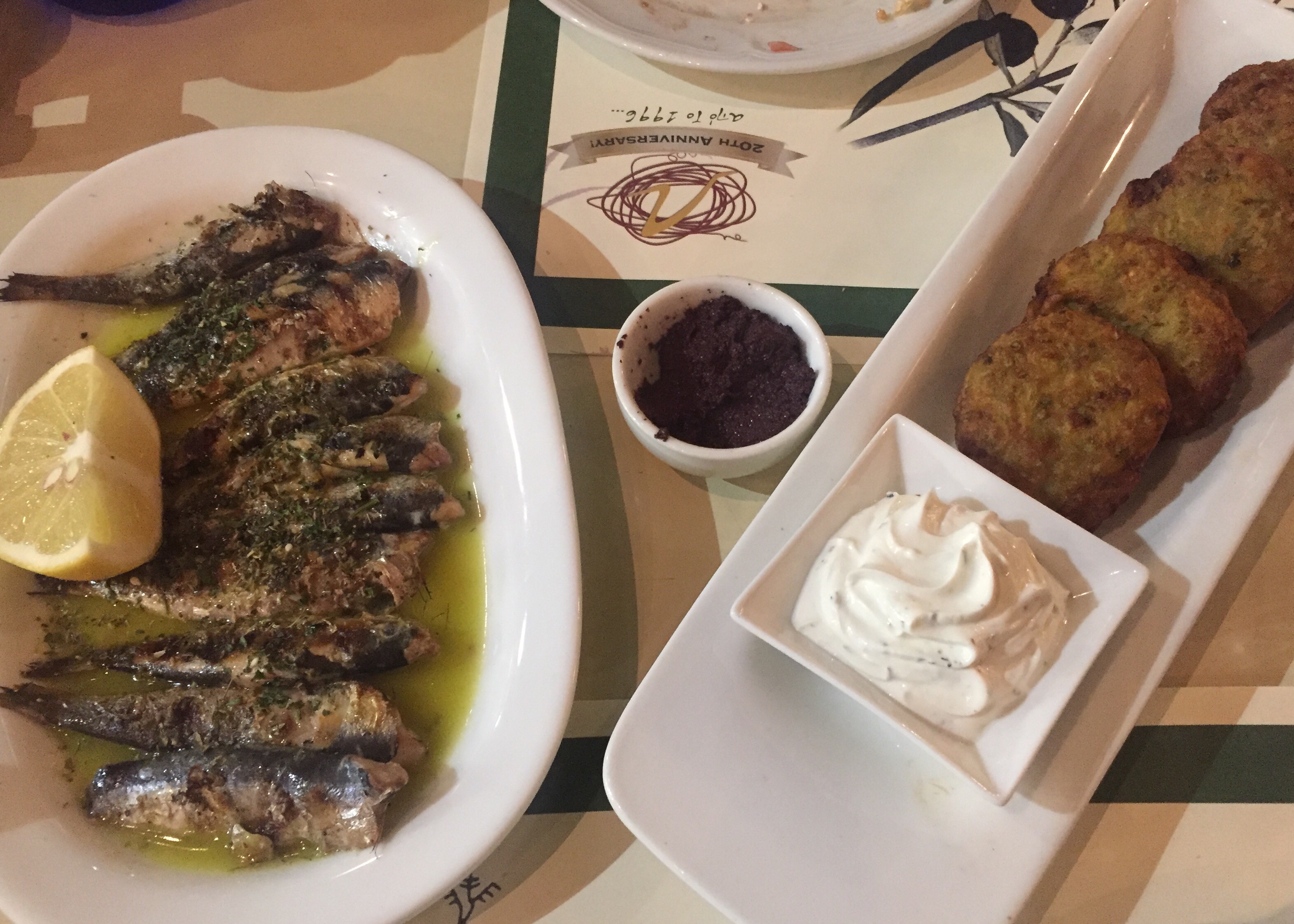 For dinner, we dragged our sleepy selves to a restaurant across from our hotel, where we ate salad with grilled cheese, black-eyed peas, beets, and herbs, followed by grilled sardines and fried zucchini cakes.