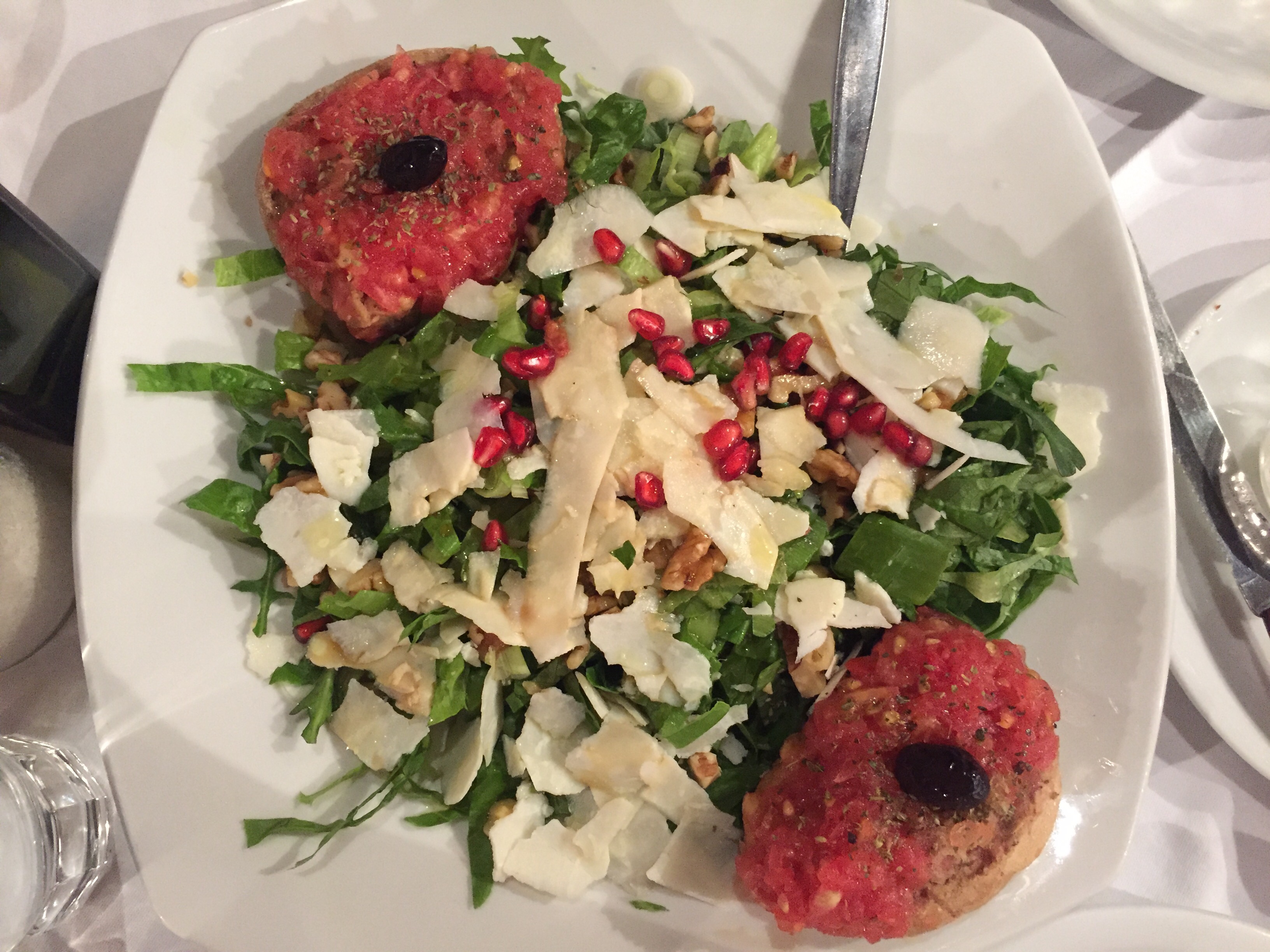 This salad was also really tasty, with walnuts, hard cheese, scallions, and pomegranate seeds. Those are mini dakos on the side, not steak tartare!