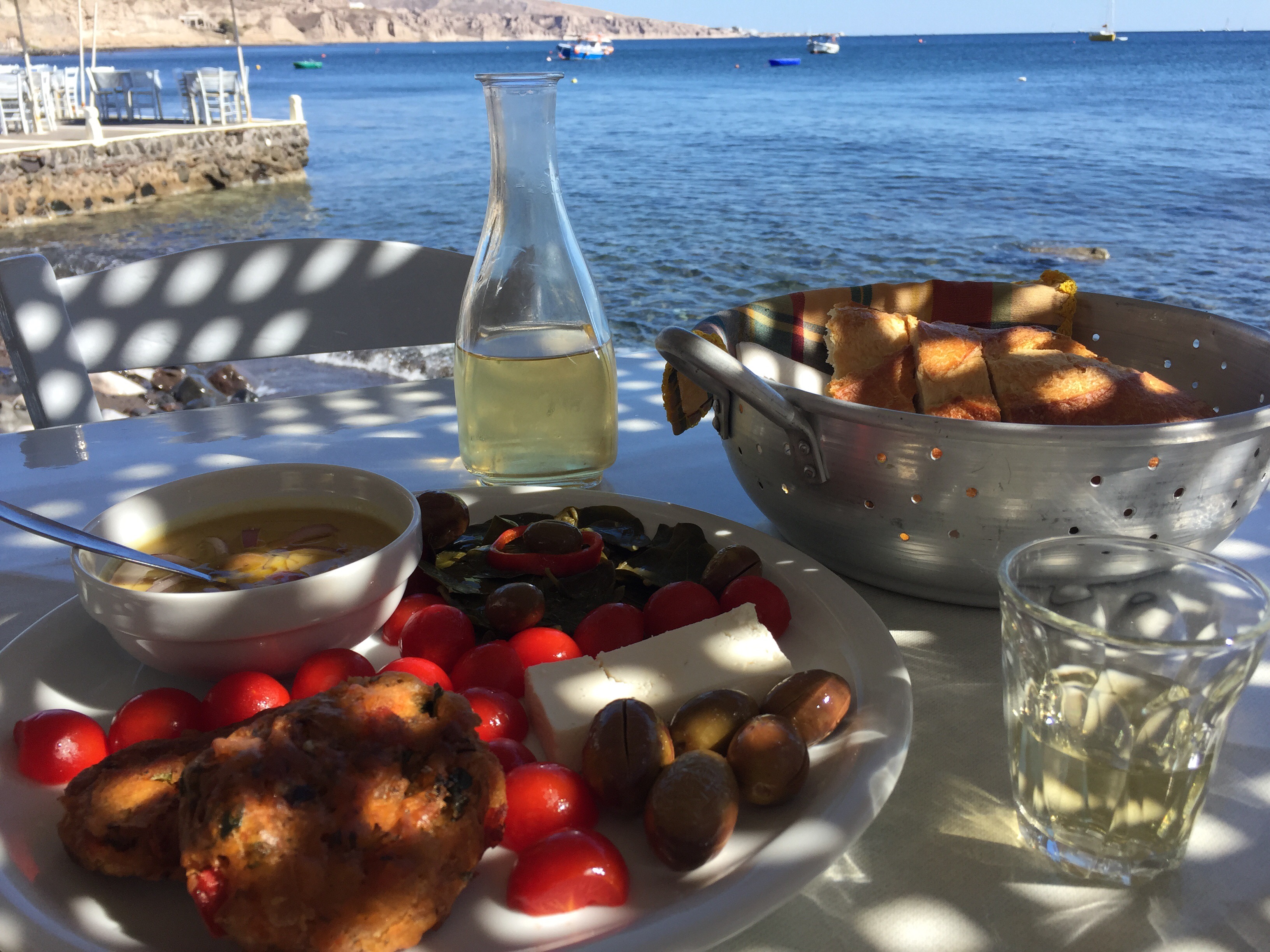 The next day it was time to head over to Milos. We enjoyed some spinach pies and coffee drinks in the port while we waited for our ferry: