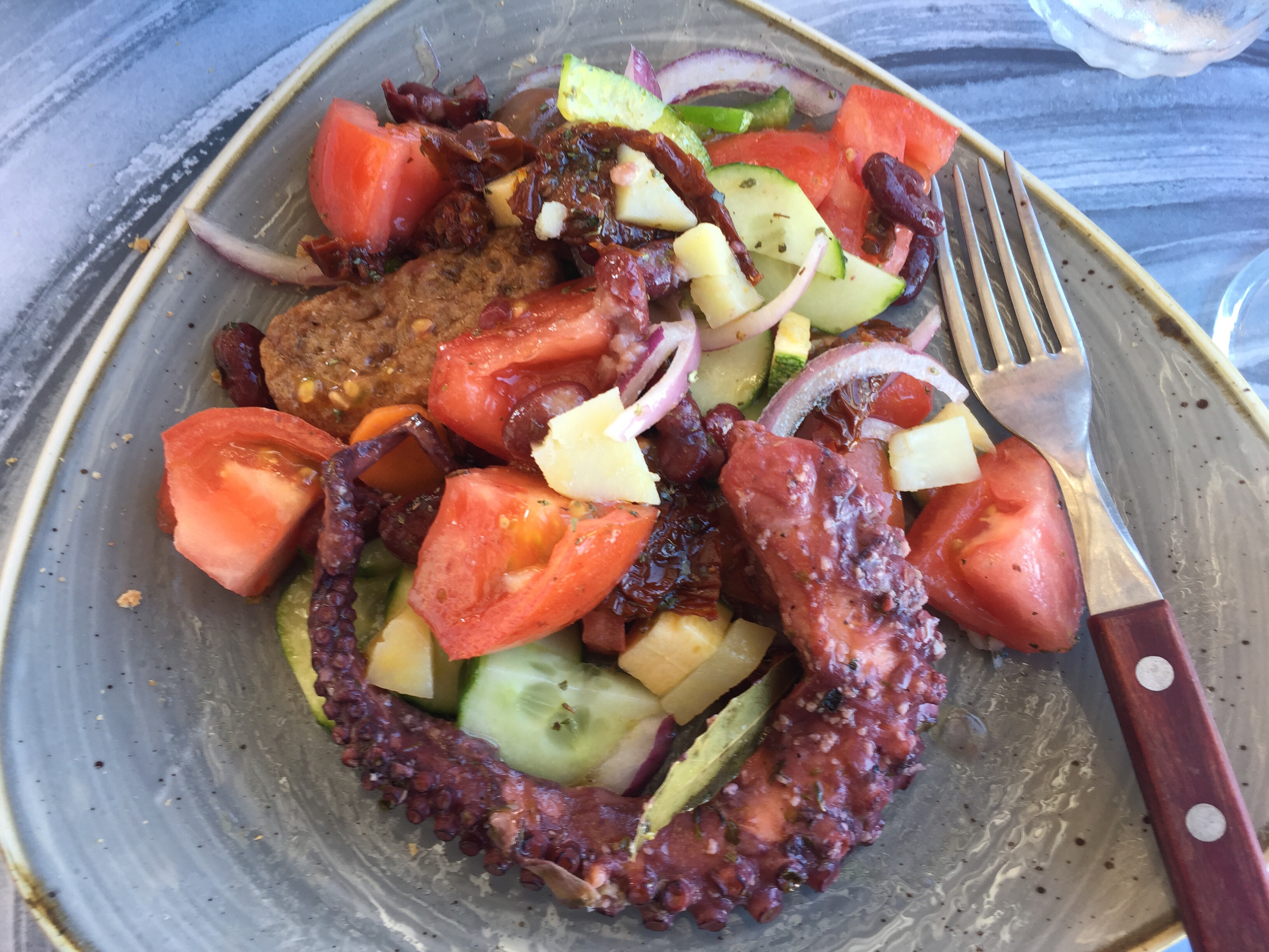 We ate at Medusa by the water. The house salad with some vinegar-braised octopus on the side: