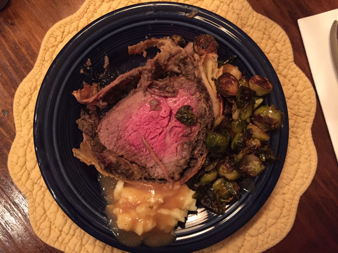 Roast pork with crackling for new year’s day (at 1 o’clock you can see some kind of rice and beans mixture—the grocery store was out of black-eyed peas, and all we could find that included them was this weird “protein mix” in the freezer section):