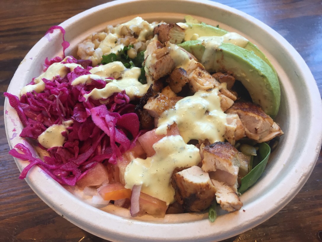 Chicken Trigo grain bowl and papitas from Bolivian Llama Party at Gotham Market at the Ashland:
