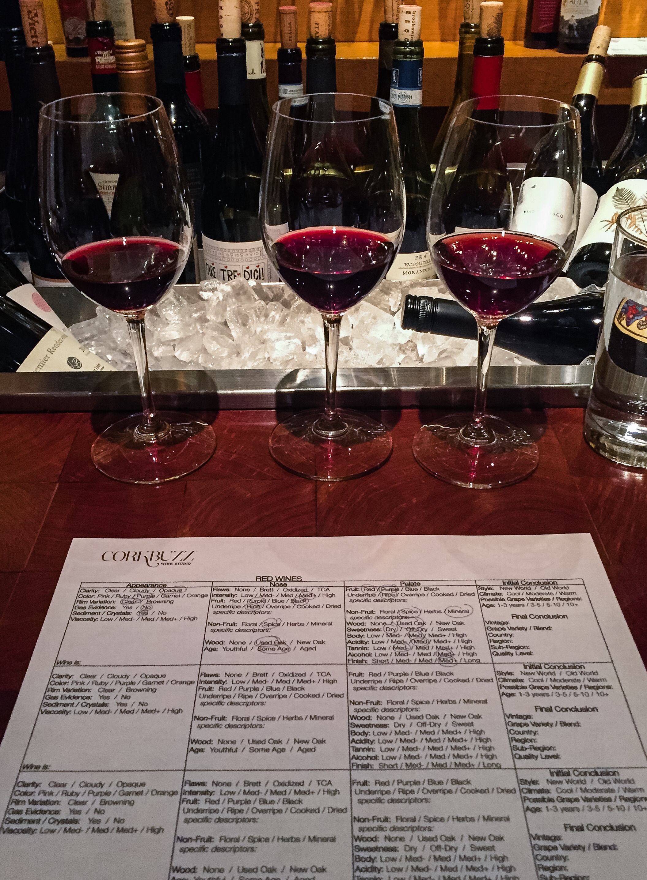 After that we went to Corkbuzz for their happy hour blind tasting special. We got two-ounce pours of three different wines with a whole tasting chart to fill out. Then we had to guess the grape, the year, the country…! We pretty much failed at everything, although I guessed correctly with California and Chile for two of the wines and pretty close with France (it was Italy) with the other. And I guessed all of the correct years, just jumbled them and assigned them to all the wrong wines!
