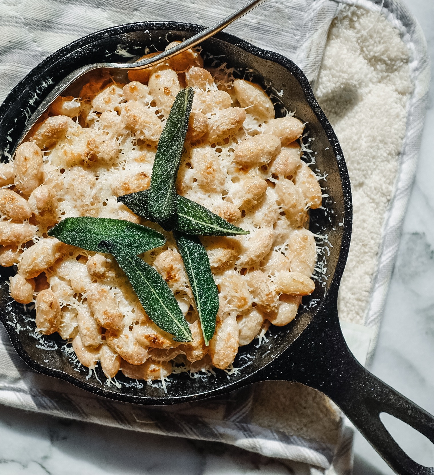 - When the beans have finished baking, put them under the broiler for a few minutes to brown the Parmesan. Allow the beans to cool for 5 minutes before serving, topped with the sage leaves.