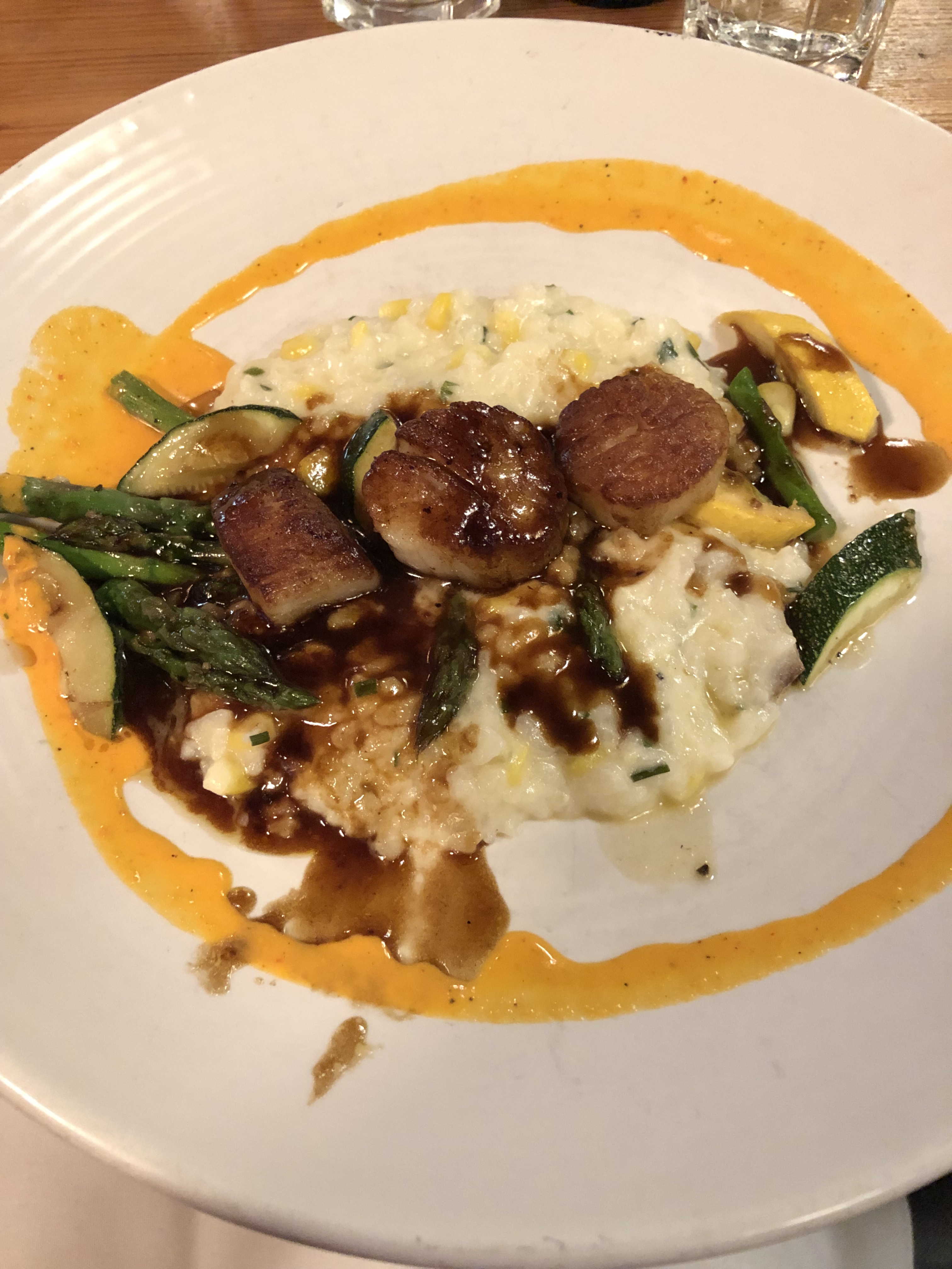 Beach Shop and Grill: We went to this super tasty seafood place last year on our visit to NC (read about that visit here), and it was so good we decided to go back. I had the sea scallops with corn risotto and seasonal veggies + a bowl of she crab soup. Our table also enjoyed some bacon-y Brussels sprouts and fried green tomatoes with pimiento cheese. There was a bit of a wait for a table, but the food was worth it, and while we waited for a table to open up, we were able to walk down by the water and watch the sun set.