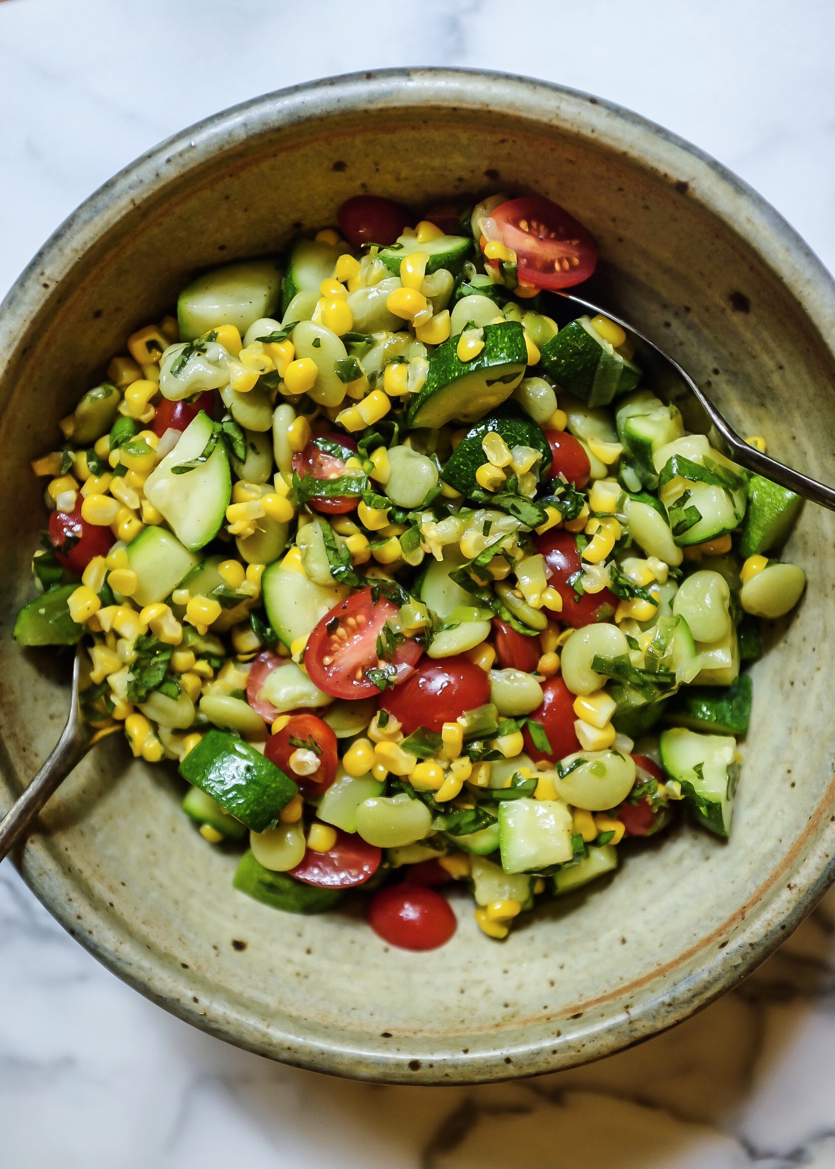 - Add the tomatoes to a large bowl and season with salt. Add the cooked vegetables, the lima beans, mint, basil, and remaining scallions. Add about half of the vinaigrette, toss, and taste. Add more vinaigrette if the salad needs it. Optional: toss the remaining vinaigrette with and few handfuls watercress and arugula and serve the salad on this bed of greens.