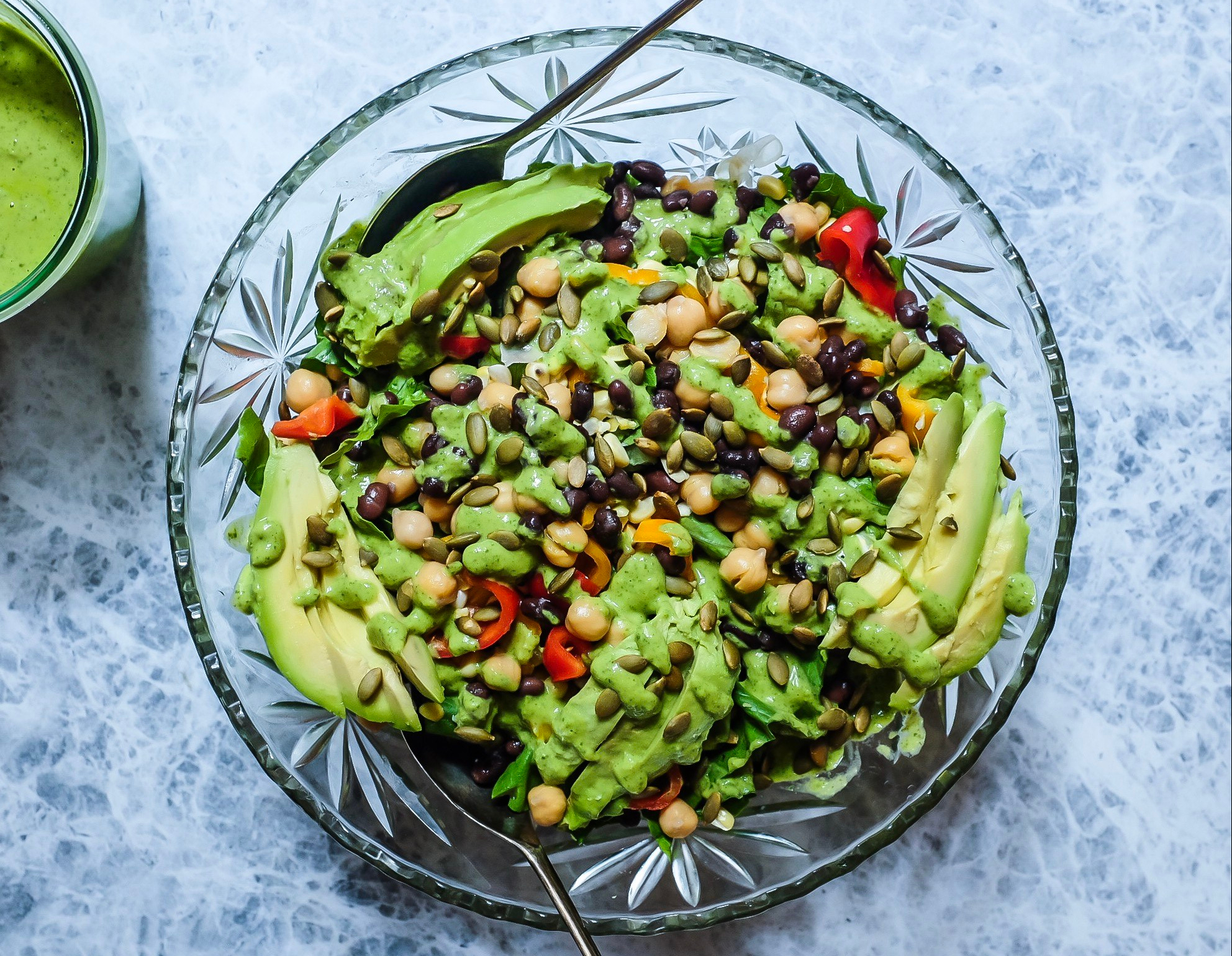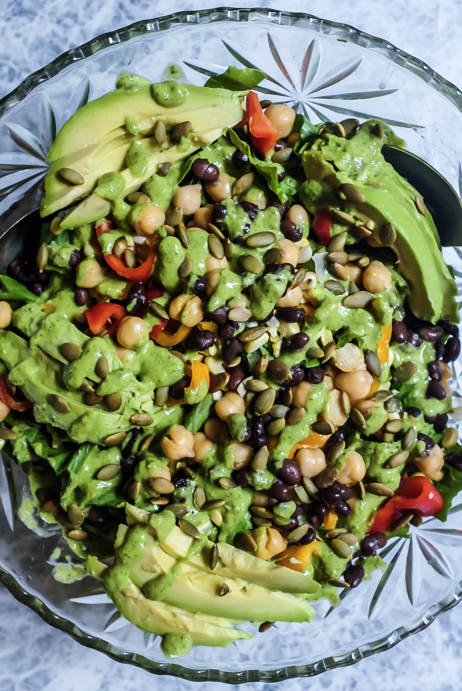 This salad is giant, fresh, and delicious—the perfect thing after a busy week of too many restaurants and rushed “lunches” made of snack foods. The dairy-free dressing is made creamy by blending in chickpeas, which I didn’t think of but which I think is total genius! I actually prepared and photographed this salad two months ago but right as I was ready to write up the recipe and post it, I was hit by the first-trimester queasies and realized I had to take a blogging break since even writing about food made me ill. Thank goodness that’s all over now, and I can happily write about this salad and would just as happily eat it! I have had the type of busy week described above, so I might have to whip up this recipe soon for some much needed balance. Hope you all have a wonderful, relaxing, week, and I’ll see you next time!